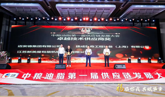 9月20日,中糧油脂第一屆供應鏈發展大會在天津召開。作為中糧集團長期以來的戰略合作伙伴,新美星憑借合作中展現出來的卓越品質和優質服務,被評為中糧油脂智能產線和倉儲物流領域唯一的“卓越技術供應商”。