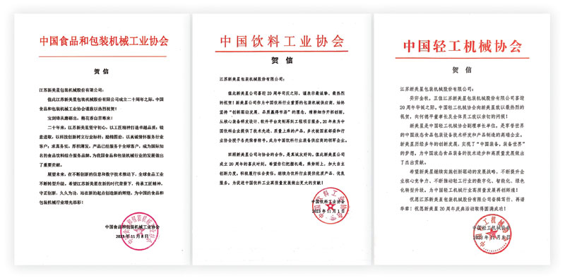 時光荏苒,我“星”依然。當(dāng)時間定格在新美星20周年慶典的喜慶時刻,中國食品和包裝機械工業(yè)協(xié)會、中國飲料工業(yè)協(xié)會、中國輕工機械協(xié)會紛紛發(fā)來賀信,熱烈祝賀新美星成立20周年!