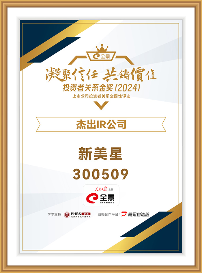 8月27日,第六屆全景投資者關系金獎榜單正式揭曉。在常規內容評審,及數字化投關、中小投資者關切與回應、機構關注度、市值管理、股東回報、ESG價值傳播六大維度的評價中,新美星憑借出色的投資者關系管理實踐,一舉摘得“杰出IR公司”獎。這不僅是對新美星在資本市場中持續構建透明、高效溝通體系的高度認可,更是對公司治理、價值傳遞的充分肯定。